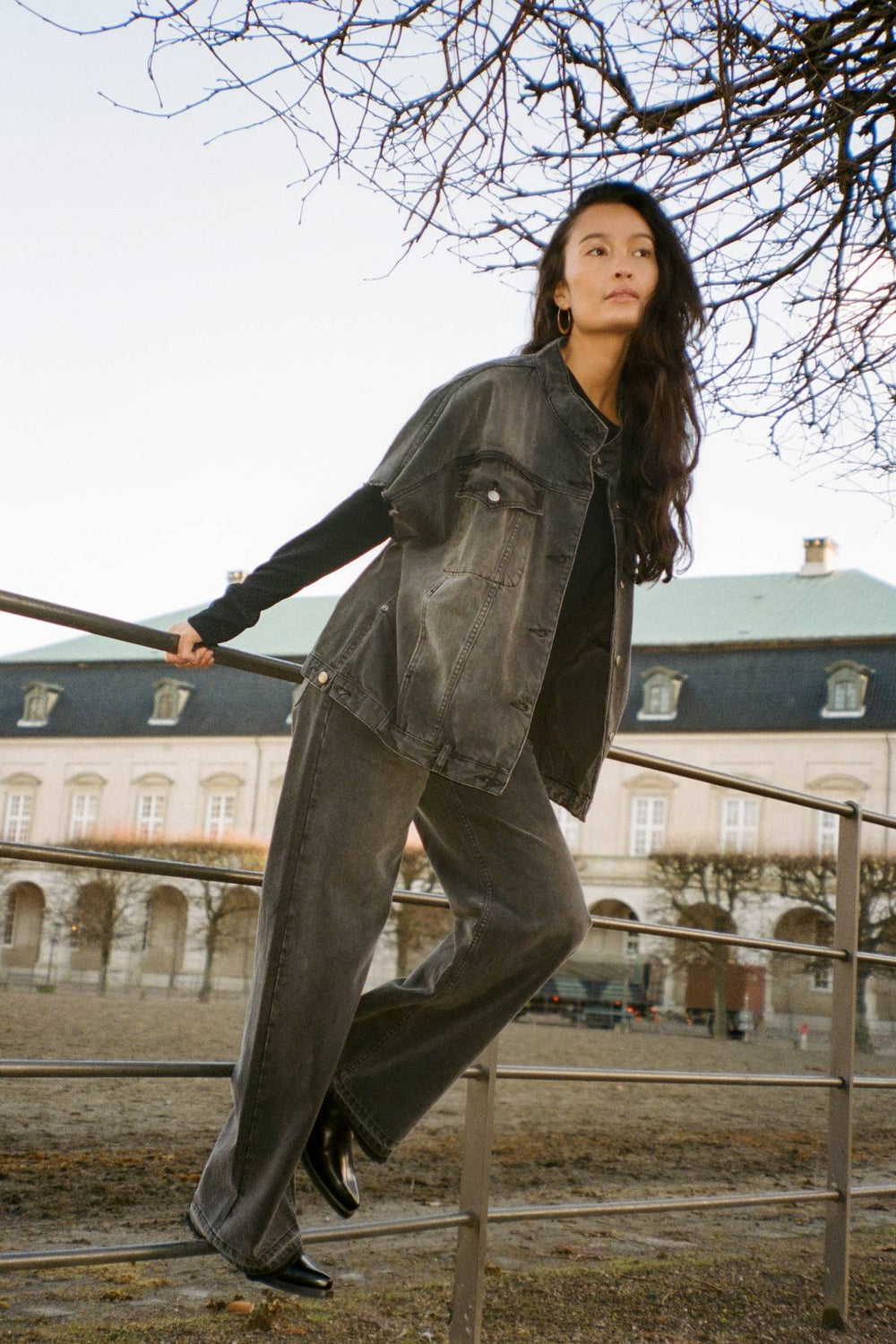 Gemaakt van een klassieke denimstof, wordt het vest gedefinieerd door een oversized silhouet met een knoopsluiting aan de voorkant, zijzakken, borstzakken en een kleine kraag.