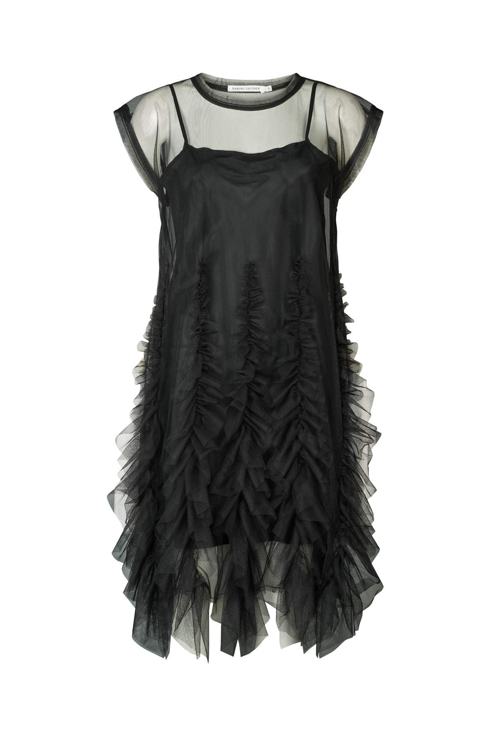 Gemaakt van een lichte, doorschijnende stof is de tulejurk perfect om in laagjes te dragen. De losse pasvorm wordt gekenmerkt door korte mouwtjes, een ronde halslijn en een overvloed aan ruches die zorgen voor een speelse en frisse uitstraling.