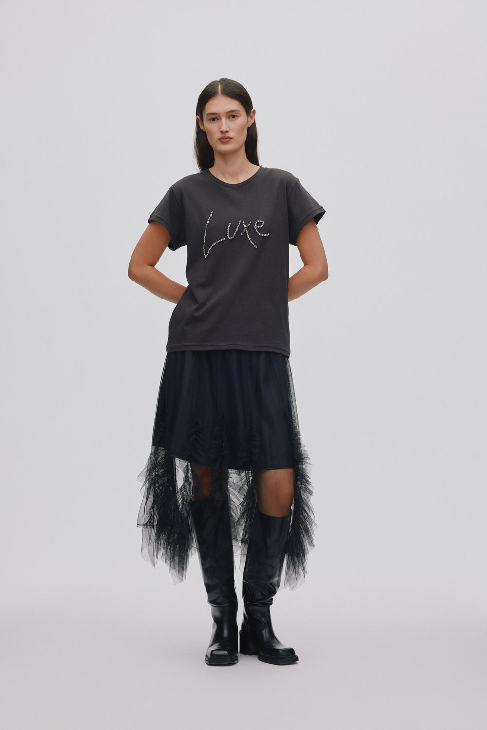 Voeg een speels maar stijlvol accent toe aan je day-to-night garderobe met de tule rok met ruches.