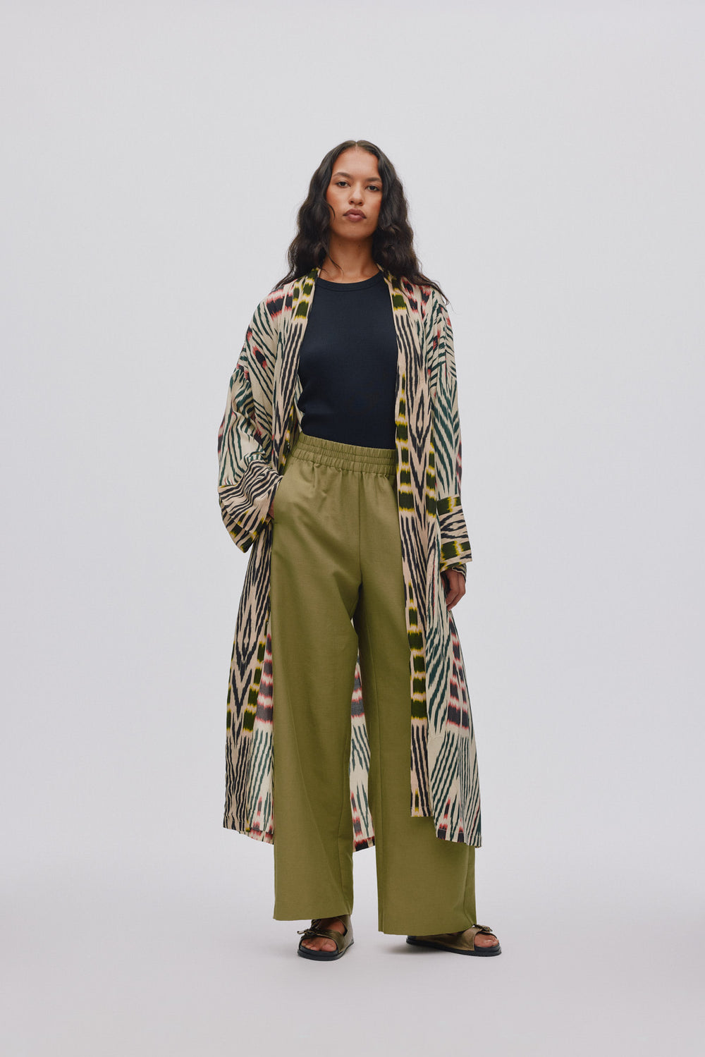 Deze lange kimonojurk valt op door een handgeverfd ikat-patroon, gemaakt door lokale kleurkunstenaars in het kleuratelier van Rabens op Bali. Dit zorgt voor lichte variaties in kleur en patroon, waardoor elke stijl volledig uniek is.